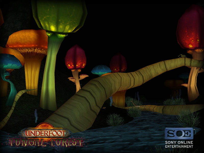 The Fungal Forest is dominated by massive and colorful mushroom trees with fungus undergrowth. There redwood-sized fungi make up the bulk of the forest, with small mushrooms, molds and lichens covering the ground. The ground is dark and moist, and in some places sinkholes in the mulch lead into caverns under the forest. The undergrowth in this area is dominated by green moss and small fungi.